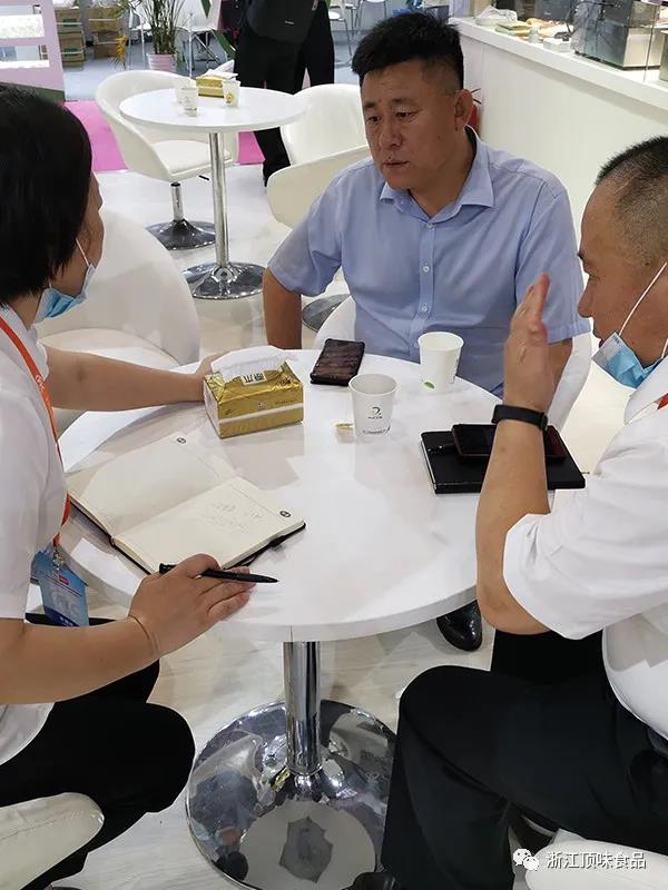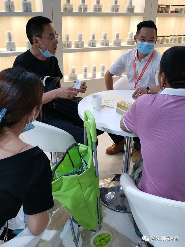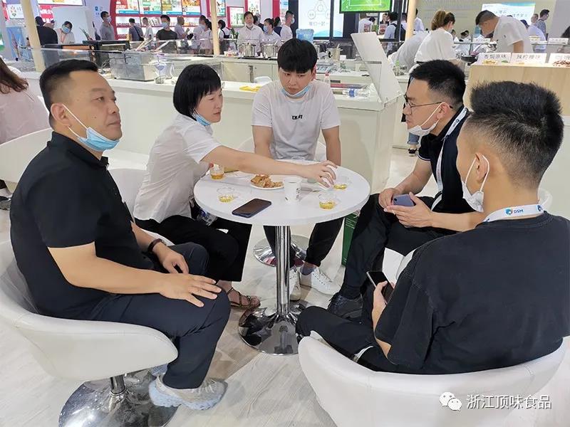 顶味精英团队热情地与新老客户分享国内外流行口味趋势,邀请客户品尝我司产品。