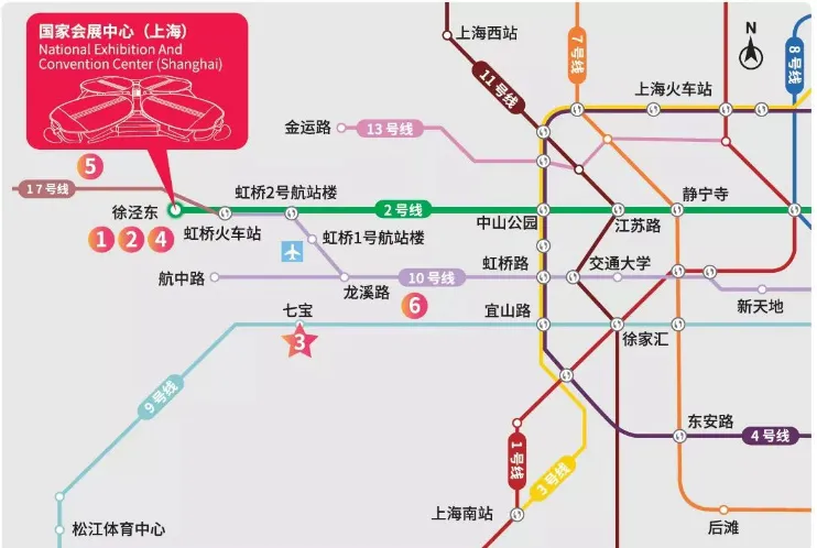 1.3 火车站出发:上海虹桥火车站距离国家会展中心1.5公里,可乘地铁2号线到达国家会展中心;